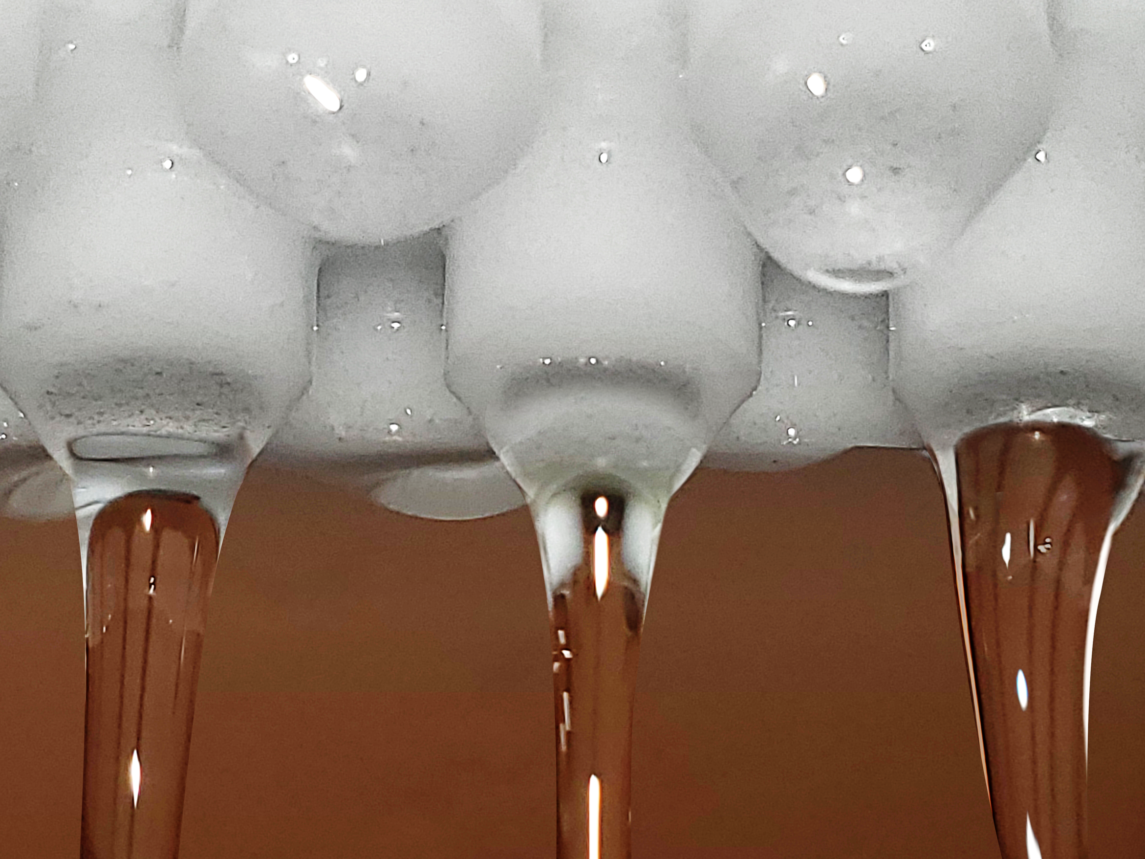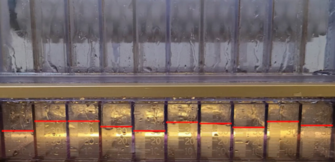Observe the uneven water flow pattern across the length of the standard PVA brush. These irregularities in water distribution can lead to areas with insufficient water, posing a risk of damage to the wafer, reducing cleaning effectiveness, and subsequently reducing yields.
